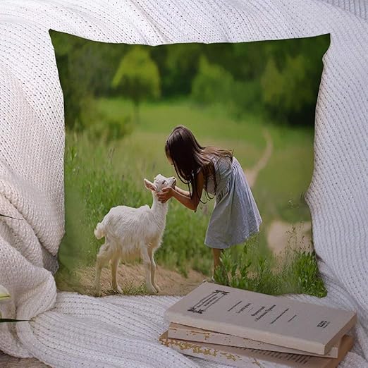 Amazon Com Decorative Pillowcase Green Child Little Girl Plays Huhs Goatling Country Animals Wildlife Goat People Cute Countryside Throw Pillow Cover Soft Square Cushion Case For Bed Couch Car 20x20 Inch Home