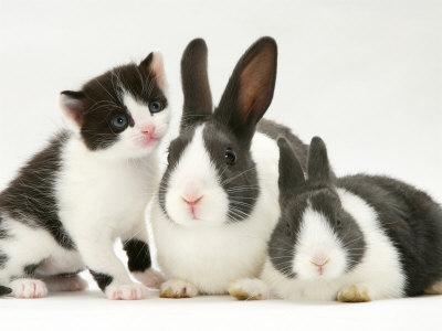 Black And White Kitten Smelling Grey And White Rabbits Photographic Print Jane Burton Art Com